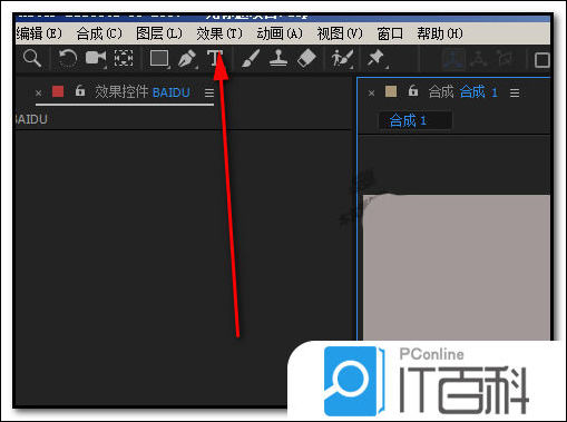 3、设置 好后,打出文字,比如,本例中的文字:BAIDU;再把文字调下位置,按V键,选 取工具。 这时,文字四周显示出8个小方块。