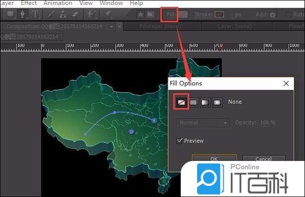 3、选中 Shape Layer 1 图层并选中 钢笔工具 ,在如图所示的设置图标上点击Fill, 在弹出窗口中设置为none。