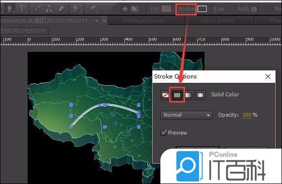 4、选中Shape Layer 1图层并选中 钢笔工具 ,在如图所示的设置图标上点击stroke,在弹出窗口中设置为 solid color 。这样就可以让图形变成线形了。