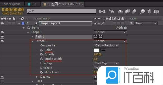 5、然后通过展开Shape Layer 1图层可以进一步设置stroke的 颜色、宽度等参数。