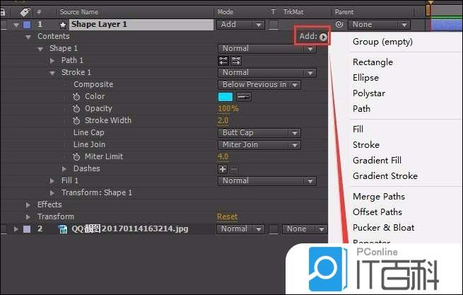 7、在如图所示的地方点击Add旁边的小三角,给形状图层加一个 Trim paths的效果 。