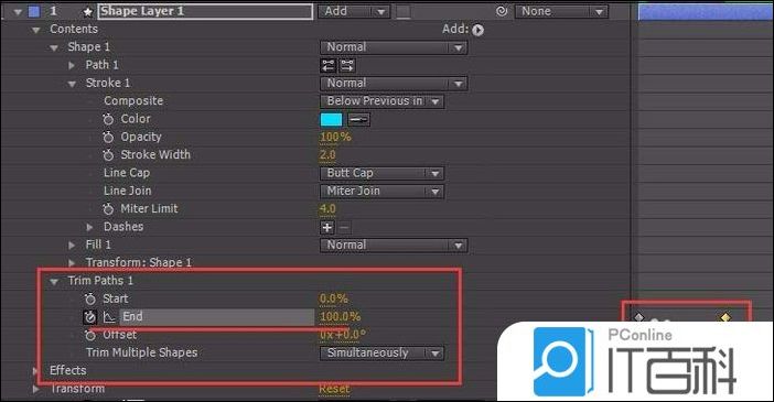 8、然后展开 Trim paths ,对 End添加关键帧 ,初始关键帧设为0,第二个 关键帧设为100 。