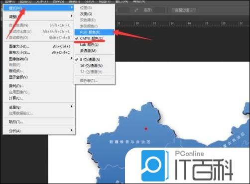 2、首先我们打开ps在图像——模式可以看出当前选择的是cmyk的模式,我们选择RGB模式!