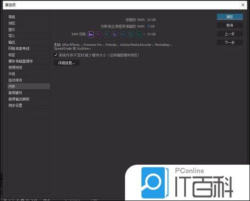 4、打开后可以看到电脑安装的内存有多少,分配给其它程序的内存有多少,留给AE的有多少。看我这里的是,电脑有16G内存,保留其它程序的内存是3G,AE用的是13G。设置好确定就可以了。