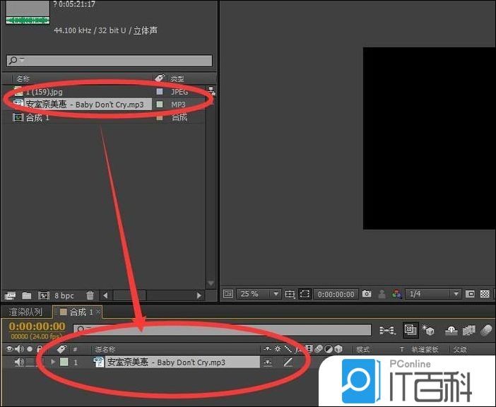 1、首先我们先登录AE,添加所需要的 音乐和背景图片