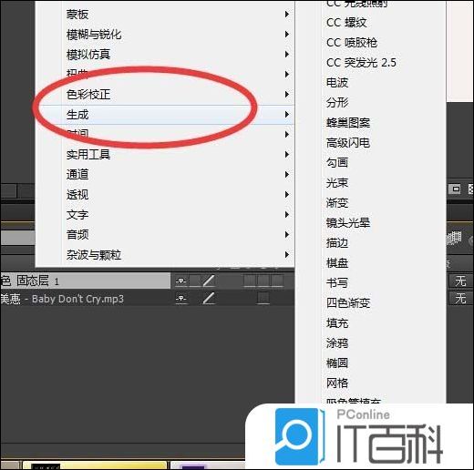 4、接着我们点击 效果-生成-音频频谱 , 把音频层选为我们的音乐
