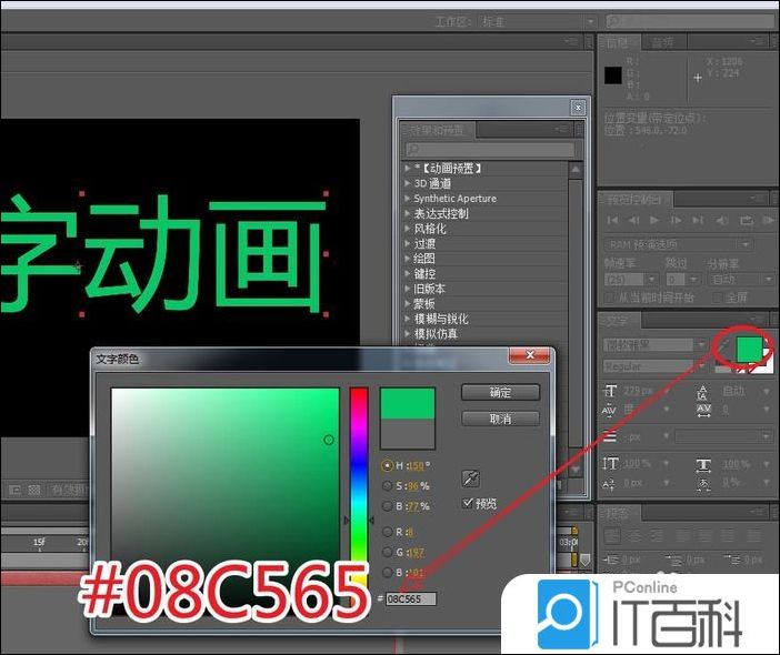 1、在“文字”面板找到文本颜色设置,将颜色设为:翠绿色(#08C565)。