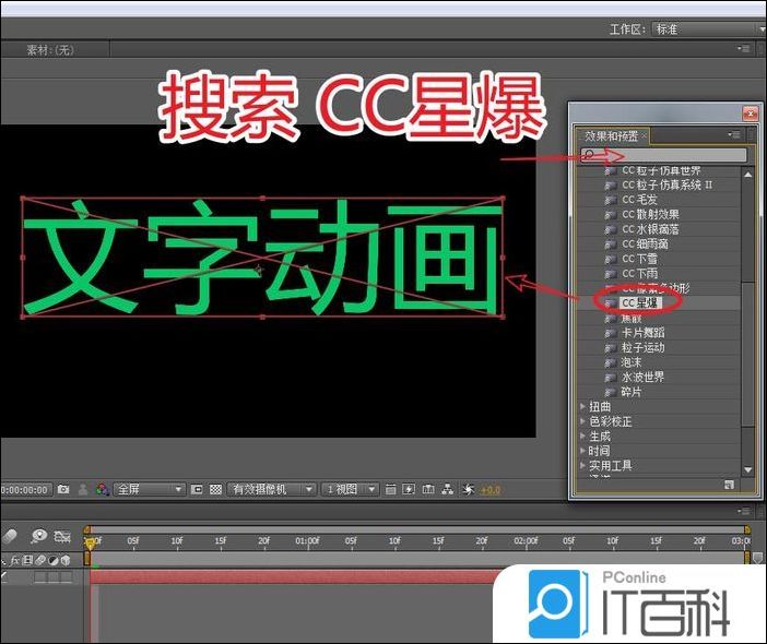 2、在“ 效果与预置 ”面板搜索 CC星爆,通过鼠标拖拽将其添加到文本层上。