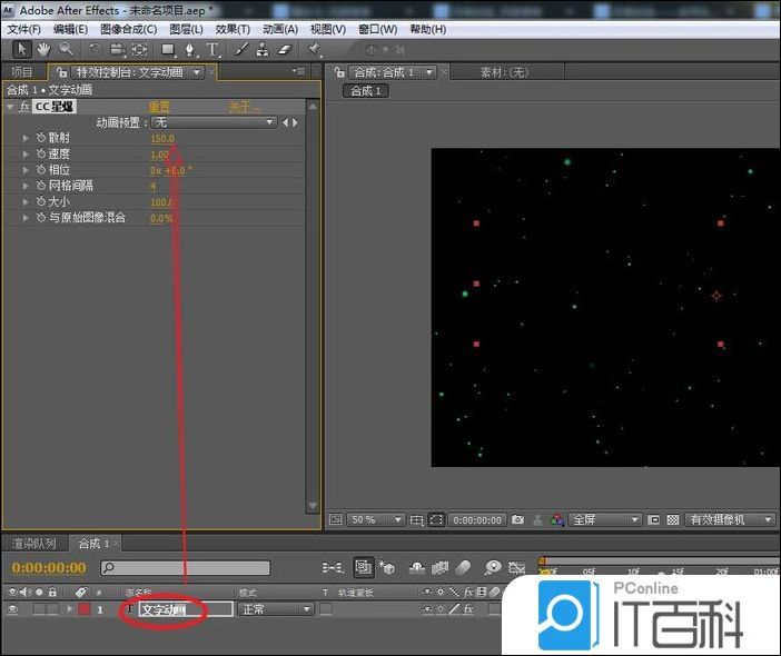 3、选择“ 文本图层 ”,在CC 星爆效果,调整“ 散射 ”参数为150,以使画面上的星点散射的范围更大。