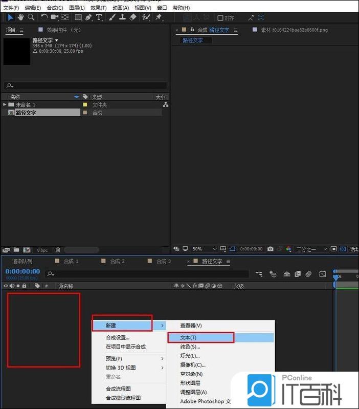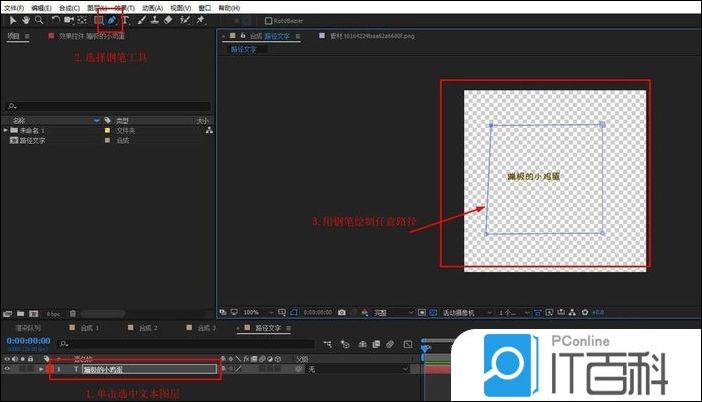 5、单击 文本图层 ,然后选择左上角的 钢笔工具 ,用钢笔工具在合成面板中绘制自己需要的 路径。( 如图中的方形路径)
