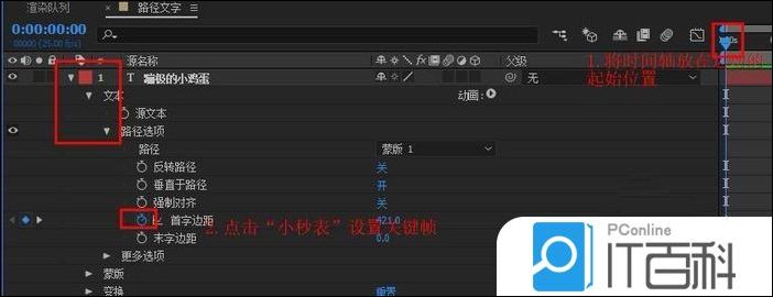 6、将时间轴放在文字运动路径的起始时间点。点击 文本图层 前的小三角符号→ 文本 前面的小三角符号→ 路径选项 前面的 小三角符 号。在出现的子菜单中找到 ” 首字边距 “ 单击前面的类似 小秒表 的图标,设置起始关键帧