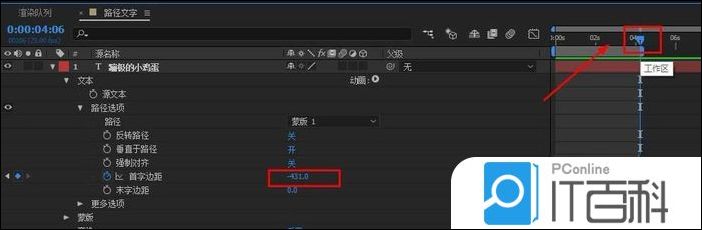 7、将 时间轴 移动到文字运动的结束时间点。更改 路径选项 的参数确定文字运动结束的关键帧。