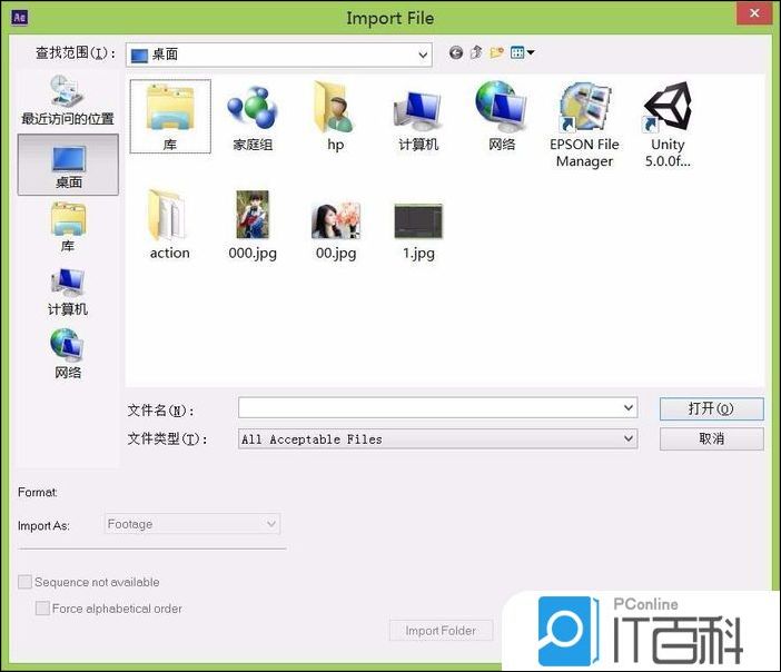 3、在import对话框内找到我们需要编辑的图片,点击打开图片就在 project 里出现了,使用鼠标左键将该图片拖拽到 composition窗口 内