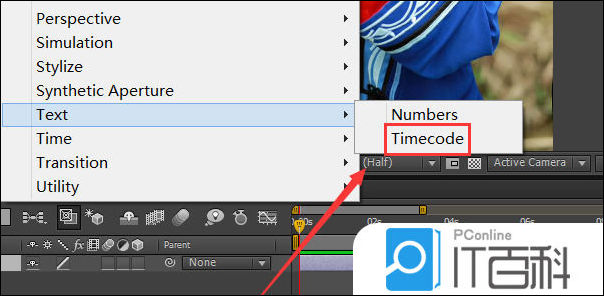 5、点击 effect菜单, 在其子级菜单里找到 text选项 ,并在text选项内找到 timecode选项 ,如图所示:
