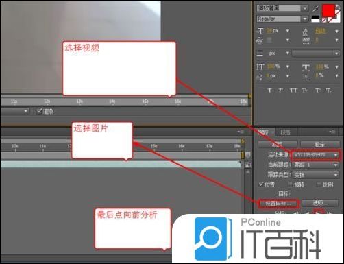 6、在右下角找到“ 跟踪 ” 列表,把“运动来源”选择 视频,“ 目标 ”选择 图片,确认无误后点击“向前分析”