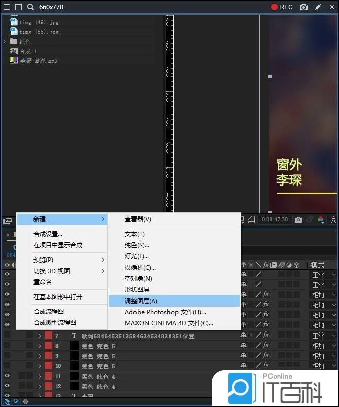5、在页面左下方的合成序列面板当中,点击鼠标右键, 选择新建一个空白的调整图层