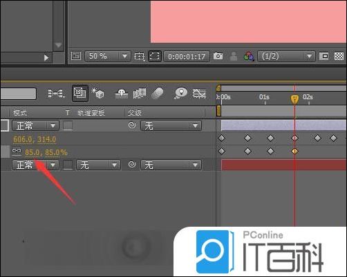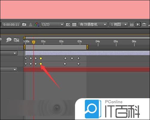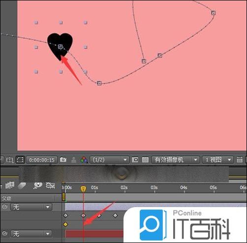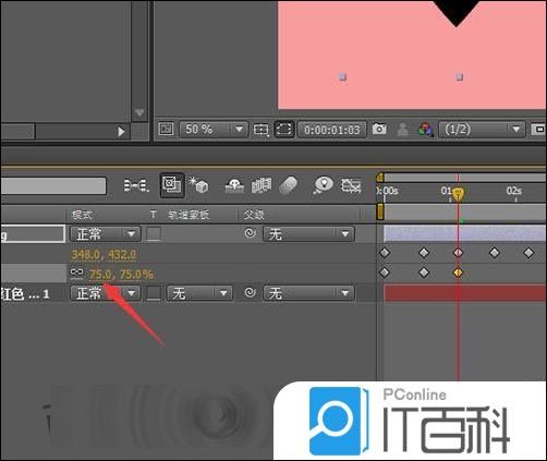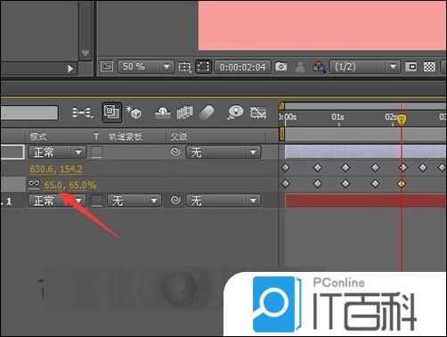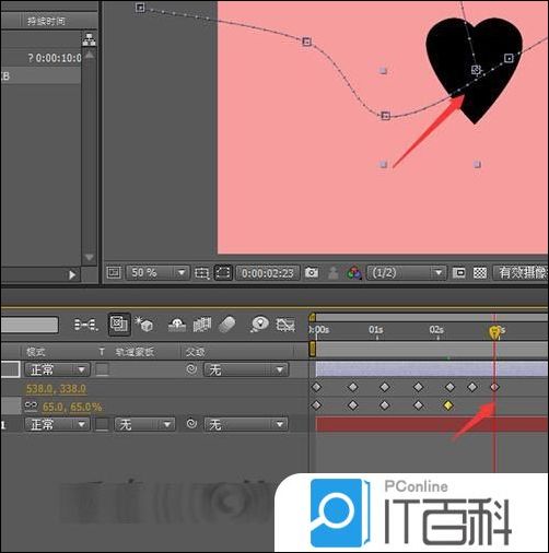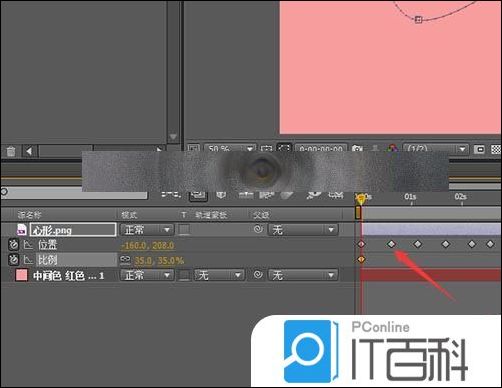 2、接下来就需要看着上面的位置的关键帧来给下面的心形添加缩放值。把时间线移动到位置的第二个关键帧上。 在缩放比例上面把它的缩放值调整为45左右。 调整之后,就会自动的在缩放上面新建一个关键帧。