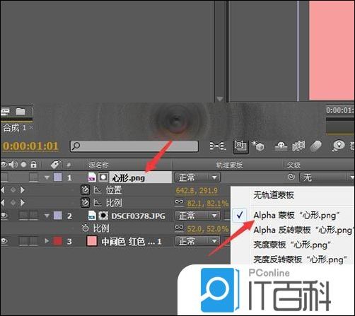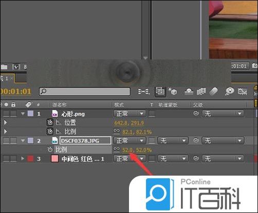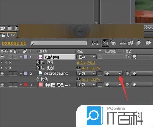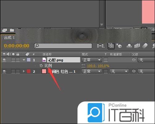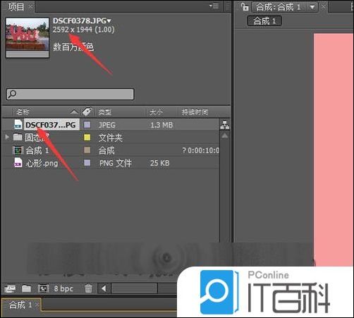 8、调整好之后,就需要导入要制作效果的相片。把相片直接拉入到心形的下面。在处理相片的时候,如果导入的相片过大,就 可点击键盘上的s键把它缩放到合成的大小。