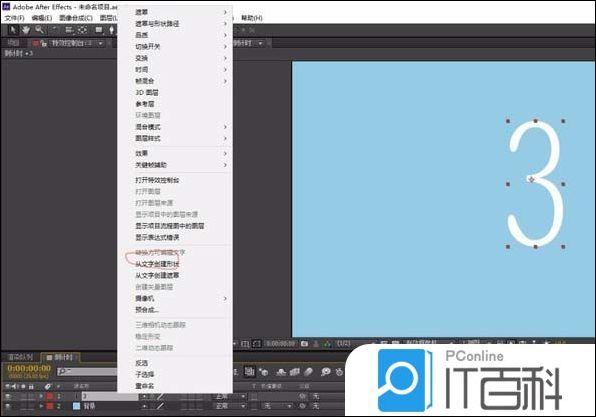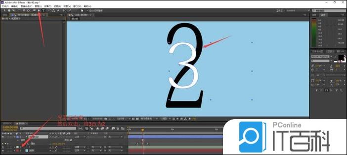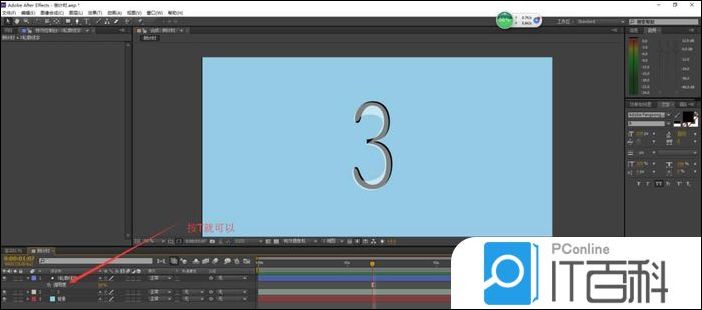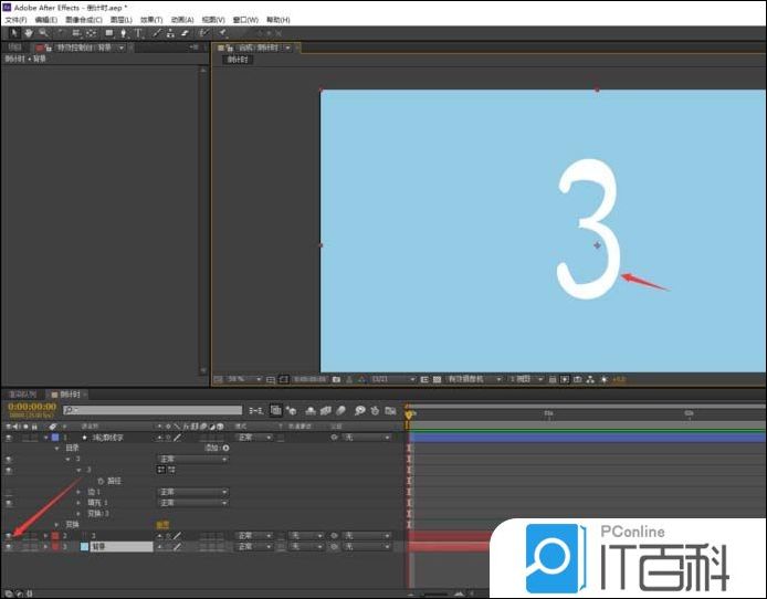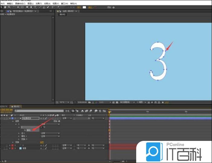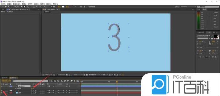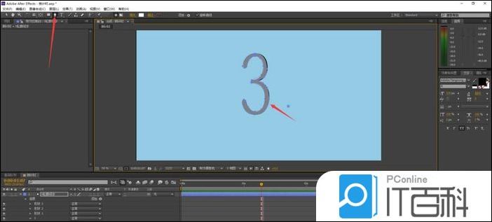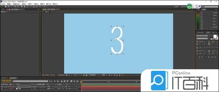 3、设定这个视频从3开始倒数,所以我们先用 文字工具 添加一个 “3”然 后在按住Y键来改变它的中心, 方便我们将它的大小调节至合适的位置。( 如图所示)