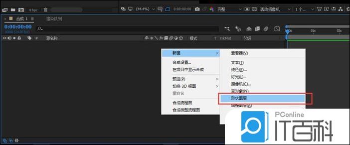 2、在该合成的图层管理窗口处右键鼠标,弹出右键鼠标选项,选择并执行新建中的形状图层,创建一个 形状图层出来。