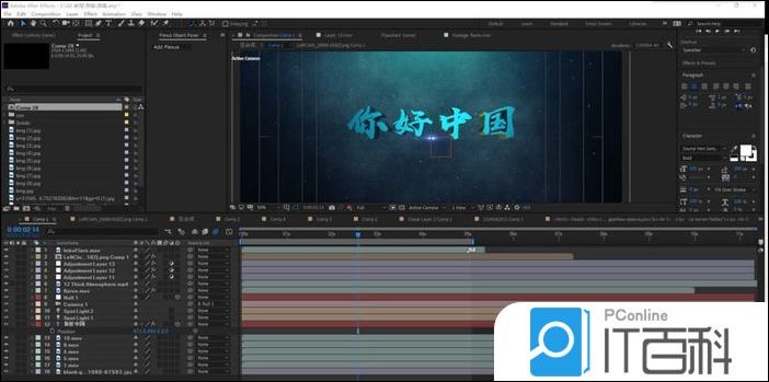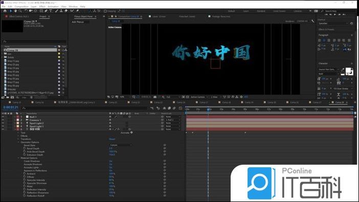 3、新建文字层,输入你好,中国!,调整好大小、位置。打开文字层的 3d属性 。新建一个 空物体、一个摄像机,和灯光层 ,将摄像机父级连接到空物体上。