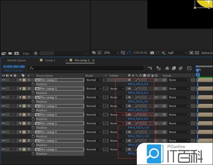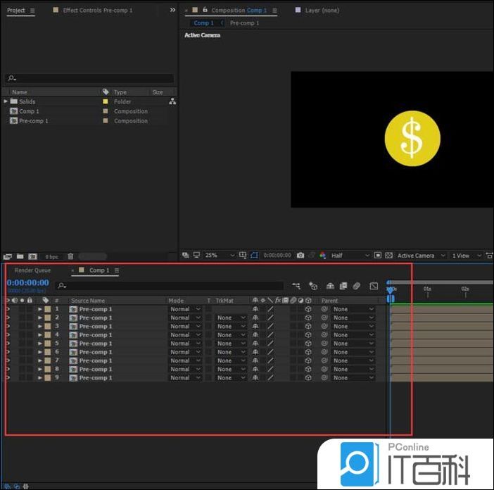 5、复制八个预合成出来。(复制的数量可以多可以少,但是合成的总数必须是但数个)