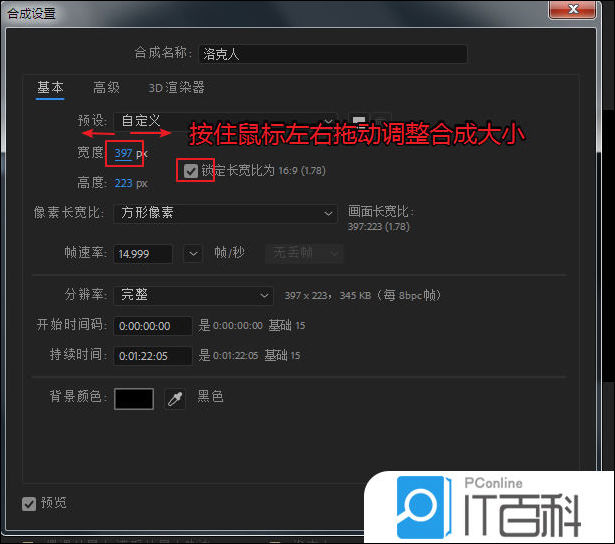 3、然后把鼠标放到宽度数值上,按住鼠标左右拖动调整合成大小。