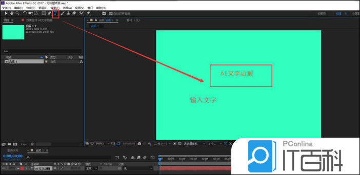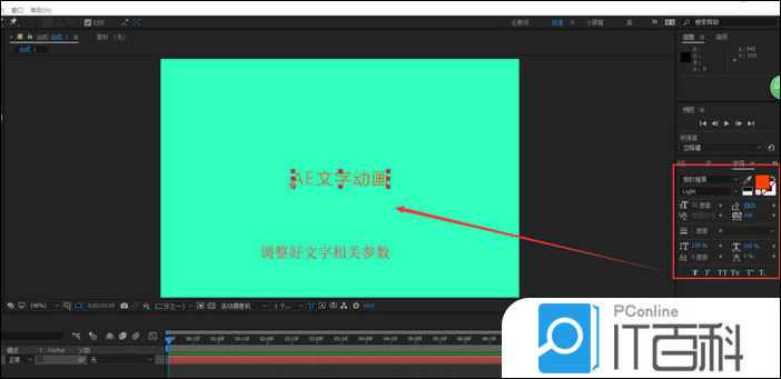 3、选中AE中的 文本工具 选项,用 文本工具 在合成场景上单击并输入文字内容,打开字符窗口,在字符中设置文字的大小等;并在对齐面板中单击 水平中齐与垂直中齐 。