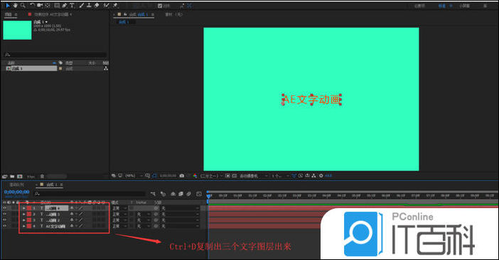 4、选中合成图层窗口中的文字图层,直接按键盘的快捷键 Ctrl+D 执行文字图层拷贝操作,在拷贝出三个文字图层出来。