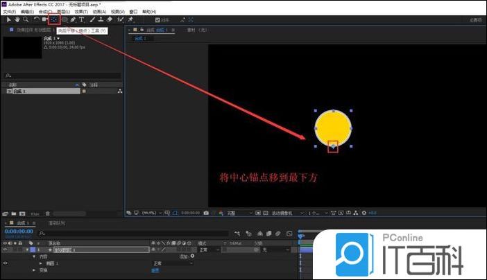 3、找到并切换到工具组中的 锚点工具 ,选中绘制的正圆,将这个圆的锚点移动到圆的正下方位置上。