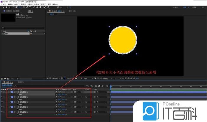 5、选中所有形状图层,按S展开缩放效果设置,依次设置缩放百分比数值,让这个圆呈递增的 百分比缩放。