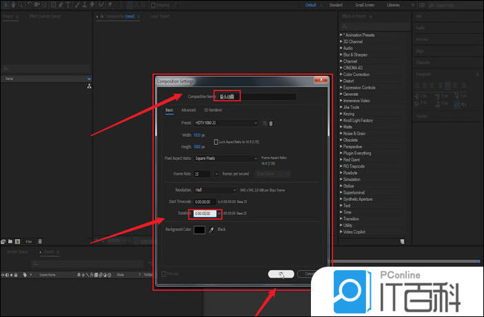 打开Adobe After Effects,创建一个新的箭头动画合成,持续时间5秒左右;