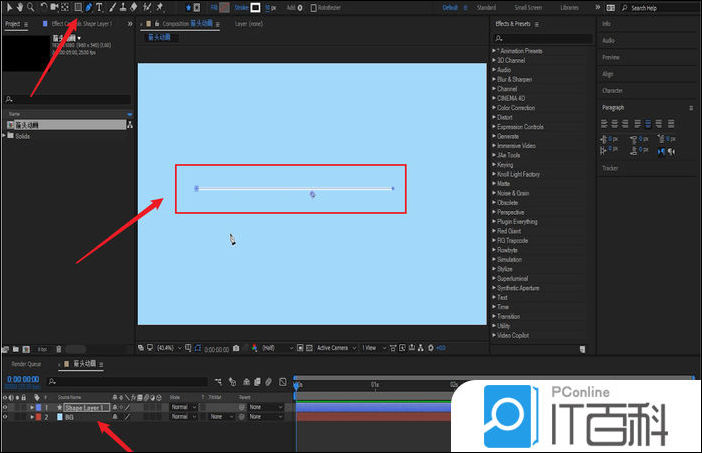 使用 钢笔工具 ,在不选中任何图层的按情况下,在合成中画出一条直线,创建一个新的形状图层,关闭填充,调整描边的大小;(也可以直接新建一个形状图层,然后使用钢笔工具画出一条直线)