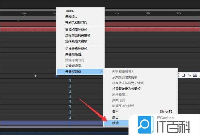 同时,为了达到更平滑的效果,我们选中两个关键帧之后, 将它之间的辅助效果设置为缓动模式 。