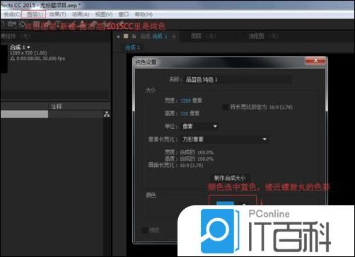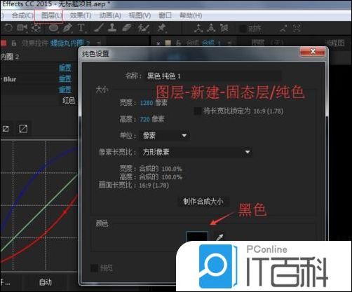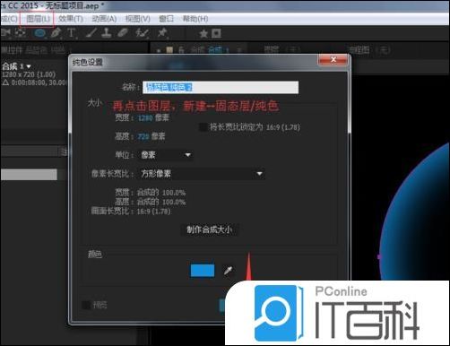 2、点击图层--新建--固态层(CC2015中是纯色),颜色选中蓝色,接近螺旋丸的色彩,点击确定