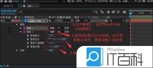 4、此时纯色图层1中出现了蒙版1,此时选中蒙版1,按键盘CTRL+D ,就会出现蒙版2,将蒙版2的模式改为相减,调整羽化和扩展
