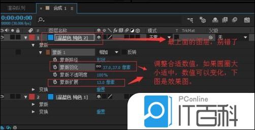 19、再给螺旋丸添加中心的发光点,越来越接近最终效果了,新建固态层 白色 确定,按AIT键画出中心圈,修改羽化参数。参考图片