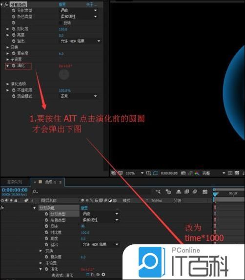 12、为了这它动起来,我们添加表达式,按住AIT不松,点击演化前的小圆圈,会出现表达式,输入tiem*1000