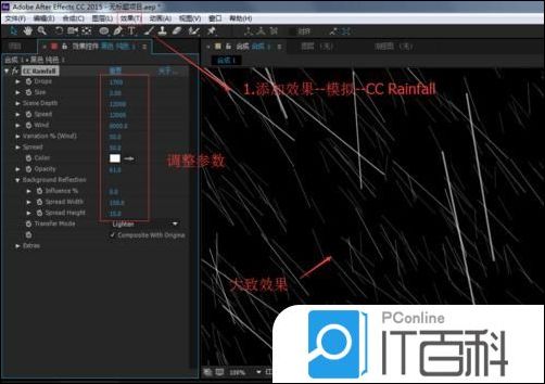 13、为此图层添加 CC Rainfall效果 , 是在效果--模拟里面。调整适当的参数,可以参考图片。