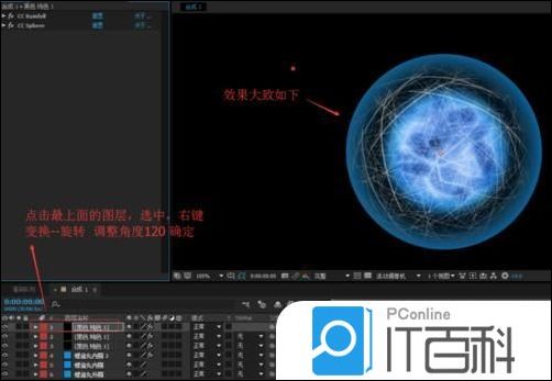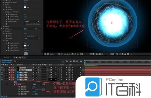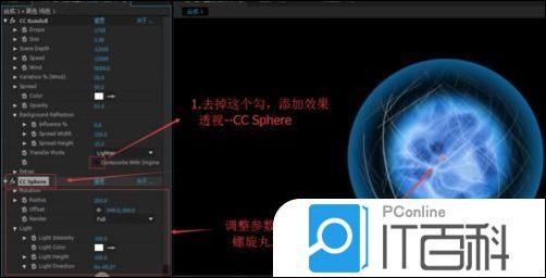 14、勾选掉CC Rainfall效果当中的 compposite with origina 前面的小对勾,这样就和前面的图片融合到一起了,让前面添加的颗粒变成球形 添加 CC Sphere 是在效果的透视当中调整参数,可以参考图片