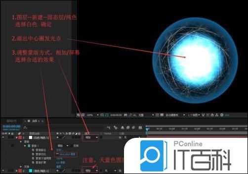 18、此时已经看出了螺旋丸的轮廓,不过还不太像我们加深下圆心质感,更逼真新建一个天蓝色固态层(图中是青色),按住AIT在中心画一个小圆调整羽化参数和叠加模式,大家参考图片