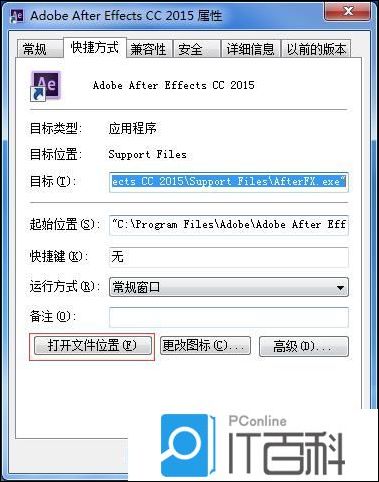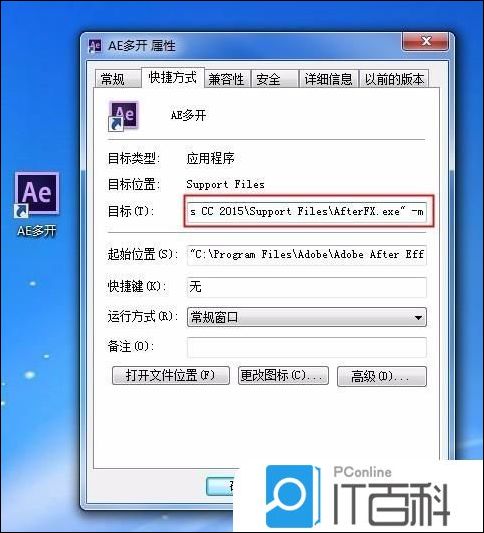4、选择桌面上的AE快捷方式,右键 “属性 ”将“ 目标 ”参数改为如下,其实也就是在后面加了“ -m” ( 是空格-m,不要忘了空格,否则出错~!) 改好之后点击确定。
