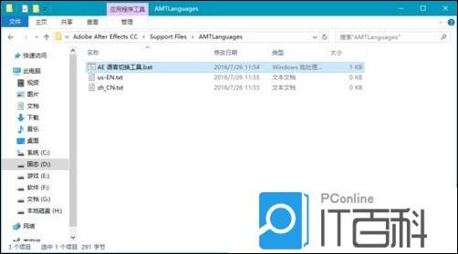 通过写一个批处理程序来对AE CC 进行快捷的语言切换。我们知道AE CC 安装目录下的Support Files\AMTLanguages 里存在着控制AE显示语言的zh_CN.txt(存在此文件则AE为中文)与 us-EN.txt(存在此文件则AE为英文)两种文件。我们在切换语言时需要新建一个再把原来的删除掉,相当麻烦。这里我为大家写了一个简单的批处理文件,来进行快捷方便的语言切换。
