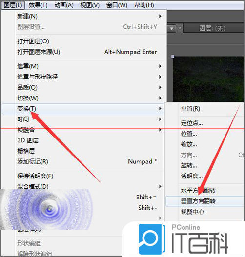4、在菜单栏中,我们点击图层,然后在它的下 拉列表中找到变换----垂直方向旋转 。当我们点击之后,同样也可以让相片进行快速的恢复正常。