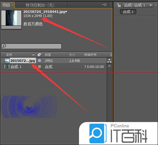 但在ae的软件中,我们只要在项目中点击一下图片,就可以在它上面图片的右边看到它的图片大小。可以看到它显示的图片宽是1536,高是2048。因为这张图片是向右边的。所以我们要新建一个和它相反的合成。