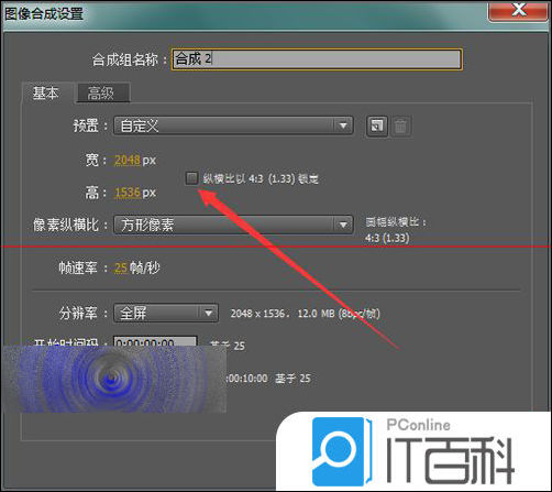 7、击菜单栏中的新建合成,然后在它弹出的图像合成设置中。我们选择自定义。把它的纵横比前面的勾取消掉。然后输入和刚才图片相反的尺寸。把它的宽设置为2048px,高为1536px。然后点击确定。