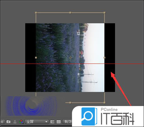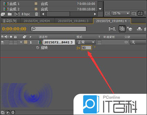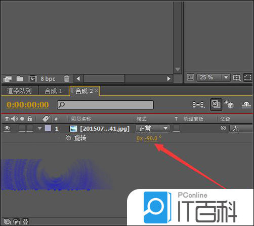 8、把这个合成新建好之后,我们把向右的那张相片拉入到这个合成中来,可以看到在这个合成中,它的右边是留有空间的。我们选中相片的图层。然后同样的英文的状态下点击键盘上的r 键进行旋转。把 它的旋转角度设置为-90 。设置好后,就可以看到相片也恢复了正常。