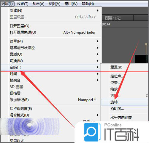 9、如果不习惯使用快捷键的话,我们同样可以在菜单中进行设置。点击菜单栏中的图层。 然后选择图层----变换----旋转 。接着在它弹出的旋转的界面中把它调整到合适的角度。