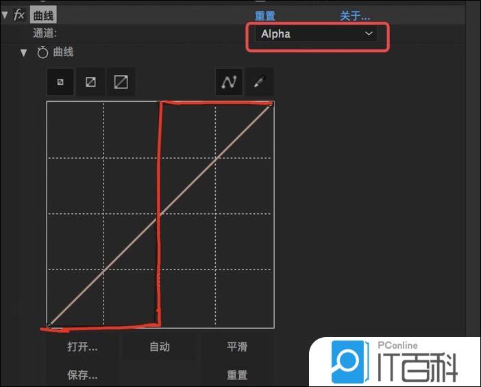 4、【 效果】->【颜色校正】->【 曲线 】, 设置Alpha通道的曲线如下。