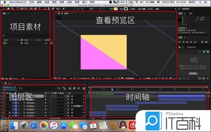 1.首先安装完AE后打开,界面默认居中是预览,左边是素材窗口,下方是时间轴和图层。